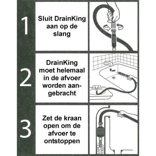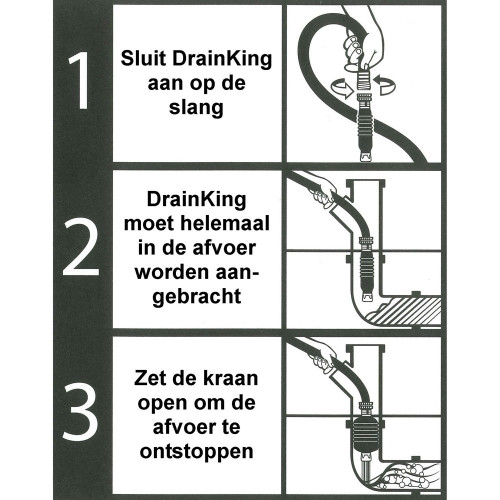 Sluit Drain-King via een slang aan op een willekeurige kraan, dan Drain-King volledig in de afvoerbuis aanbrengen. Open de kraan en de waterleidingdruk zorgt er eerst voor dat Drain-King zich uitzet en daarmee de leiding afsluit, vervolgens zorgt een pulserende waterstraal voor het wegdrukken en oplossen van de verstopping. Na het sluiten van de kraan valt de druk weg, loopt Drain-King leeg en kan dan eenvoudig weer uit de afvoerleiding worden gehaald.