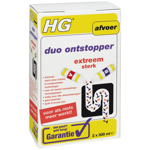 HG duo ontstopper is voor het ontstoppen van de meest hardnekkige verstoppingen in de afvoer van een gootsteen of wasbak. Vanaf nu is er geen loodgieter meer nodig! In de keuken wordt deze verstopping veroorzaakt door vet- en etensresten. In de badkamer wordt deze verstopping veroorzaakt door tandpasta, haar, zeepresten en huidvetten. HG duo ontstopper is gebaseerd op een unieke 2 componenten technologie waarmee zelf de verschillende soorten hardnekkige verstoppingen effectief verholpen kunnen worden. Het is veilig voor alle afvoerleidingen. Beide componenten zijn gebruiksklaar en hoeven niet verdund te worden, waardoor er minder kans is op spatten. Ook bruist en spat het product niet als het in de afvoer wordt gegoten.