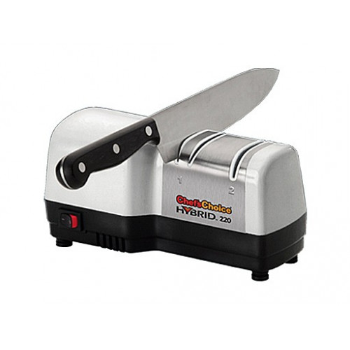 Messenslijpmachine, Chef´sChoice USA, Hybrid CC220. Model van witte kunststof met 40 Watt motor. Perfect voor alle kwaliteitsmessen met een gladde én gekartelde snede. Twee fasen: elektrisch slijpen en handmatig polijsten. Razendsnel en eenvoudig een tweevoudig schuinaflopende messnede met een slijphoek van 20°. Revolutionaire slijptechniek met 100% diamanten, Criss-Cross™ technologie en precisie-geleidingen. Voor extreem scherpe messen met ´bite´. 2 jaar garantie. In doos.