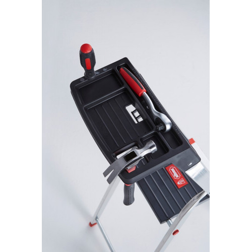 De huishoudtrap biedt je maximale zekerheid. Met zijn afgeronde treden en kniebeugel sta je prettig en ontspannen. De tooltray geeft je daarnaast ook nog alle mogelijkheid om gereedschap of materiaal op te leggen. De Lima is een complete huishoudtrap die past in elk huishouden.
