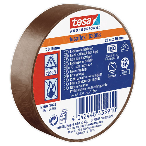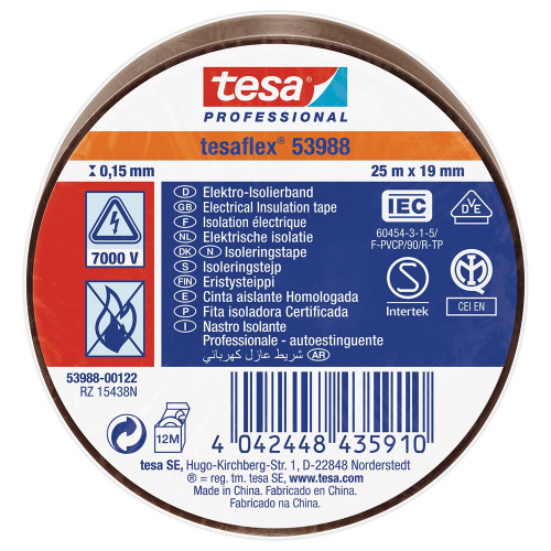 De elektrische isolatietape tesaflex 53988 is een betrouwbare hulp voor elektriciens en andere vakmensen. Kenmerkend zijn de relatief dikke drager, de hoge flexibiliteit en de sterke kleefkracht (zelfs bij lage temperaturen). De PVC isolatietape zeer geschikt voor isolatie en markering van kabels, maar ook voor reparaties. Gezien het brede aanbod aan kleuren - rood, blauw, bruin, zwart, wit, grijs, geel en geel/groen -, is de tape ook zeer geschikt als markeringstape. tesaflex 53988 is gecertificieerd volgens alle relevante standaarden bestand tegen temperaturen tot +90° C.