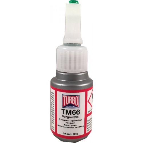 Hoogvast borgmiddel (één component lijm) voor het hoogwaardig lijmen en afdichten van schroefdraadverbindingen. Maak de te lijmen delen goed schoon met Dr. Turbo Reiniger. Breng voldoende borgmiddel aan en plaats de delen tegen elkaar. Het materiaal reageert, zodra deze luchtdicht op elkaar zijn aangesloten. Alleen te demonteren door verhitting. Goed hechtend en temperatuurbestendig van – 50 °C tot + 150 °C. Evenals TM11 & TM44 is TM66 geschikt voor alle metalen en oppervlakte behandelde materialen.