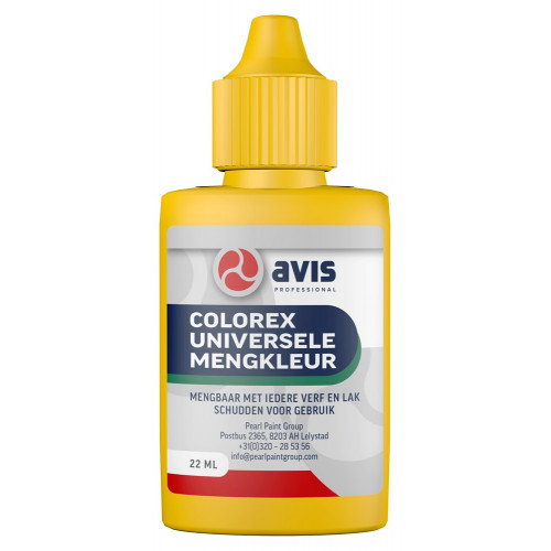 Avis Colorex is ontwikkeld voor het op kleur brengen van verven en lakken. Het beïnvloedt de eigenschappen van de verf niet en is oplosmiddelvrij. Voor het op kleur brengen van verven en lakken op basis van olie-, alkydhars, emulsie , chloorrubber, enz. Het is ook toepasbaar in moderne watergedragen producten. Bevat geen oplosmiddelen, velt niet en zakt niet uit. De kleurpigmenten zijn krachtig, zuiver en lichtecht.