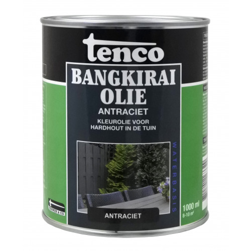 Tenco Bangkiraiolie antraciet geeft in één behandeling uw bangkiraihout een antracieten kleur, maakt het hout waterafstotend en geeft optimale bescherming Op waterbasis, oplosmiddel, veilig voor mens en milieu Geeft uw hout een mooie antraciete kleur op een simpele manier Beschermt het hout en maakt het waterafstotend Speciaal voor Bangkirai-hout