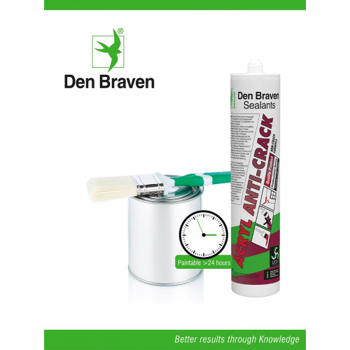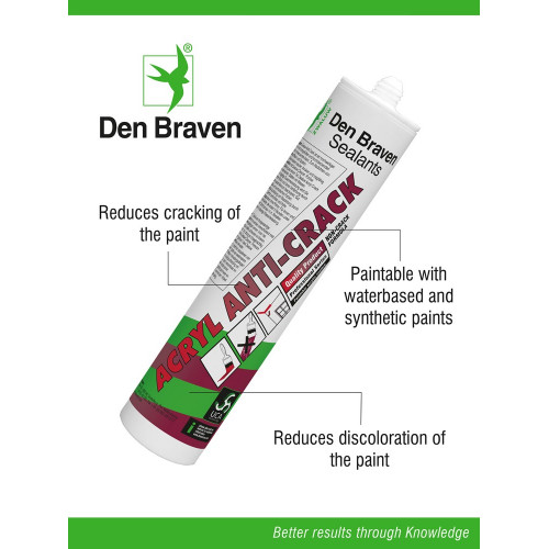 Zwaluw Acryl Anti-Crack is speciaal ontwikkeld voor het afdichten van aansluitvoegen tussen vensterbanken, trappen, plafonds, wanden, plinten, houten en metalen kozijnen/vensters, beton, metselwerk en het vullen van scheuren, kieren, spijker- en schroefgaten in muren, wanden en plafonds van hout, pleisterwerk, gips, steen, beton enz.