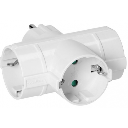 Stekker adapter T-vormig met 3 geaarde stopcontacten. CE Keurmerk Maximaal 3500W 250V 3 aansluitingen IP20 90x90mm