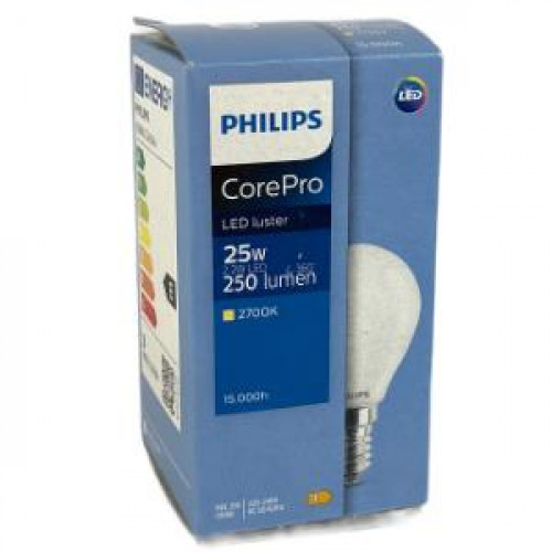 LED vervanger van de gewone kogel gloeilamp. Kleine bol, mat CorePro CLA LEDLuster ND 2.2-25W P45 E14 FR Fitting: E14 Type: G45 kogellamp Vermogen: 2.2 watt Vervanging: 25 watt Voltage: 220 - 240 volt Lichtkleur: 2700 Kelvin Lichtopbrengst : 250 lumen Kleurechtheid: CRI 80 Energielabel: E Aantal branduren: 15.000 uur Aantal schakelingen: 20.000 Garantie: 2 jaar Diameter 45 mm Hoogte 88 mm