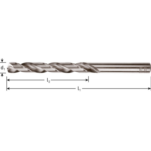 HSS-G Spiraalboor DIN 338, kort, type N, geslepen uitvoering, tophoek 135°, met splitpoint / kruisaanslijping (DIN 1412-C). Hoge precisie en standtijd.
