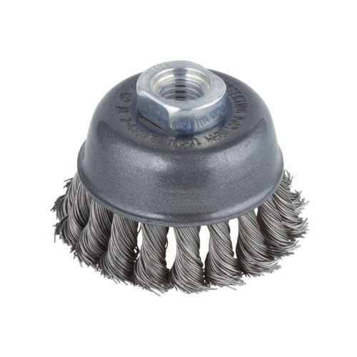Staaldraad-komborstel gevlochten. Ø 75 mm. Toerental Max. 8.500 RPM. Verpakking Blister . Lengte draad 20 mm. Diameter draad 5 mm. Schroefdraadaansluiting M14. Rechtsdraaiend. Voor ontroesten en reinigen. Ter voorbereiding van soldeer- en laswerkzaamheden. Goed geschikt Metaal, Plaat. Voorwaardelijk geschikt Non-ferrometaal, hout, Steen.