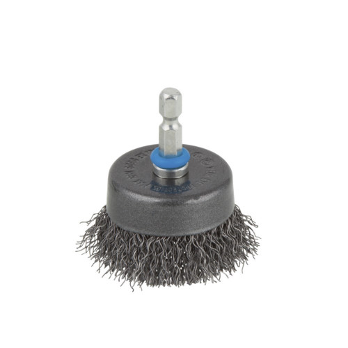 Kom-staaldraadborstel, Ø 50 mm. Lengte draad 15 mm. zeskant-schacht 1/4" (6,35 mm). Staaldraad diameter draad 0,3 mm. Gegolfd. Toerental max. 4.500 RPM. Rechtsdraaiend .Voor ontroesten en reinigen. Ter voorbereiding van soldeer- en laswerkzaamheden. Goed geschikt Metaal, Plaat. Voorwaardelijk geschikt hout, Steen .