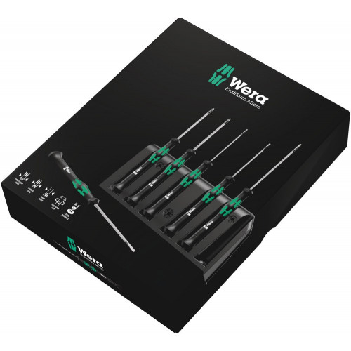 Hoogwaardige Wera Micro-schroevendraaierset voor fijnmechanische schroefwerkzaamheden. Door afsteunen van de hand op de draaikap en de sneldraaizone onder de draaikap is razendsnel heen-en-weer draaien mogelijk. Tijdrovend ompakken behoort tot het verleden. Krachtzone met geïntegreerde zachte delen zorgt voor overdracht van hoge losdraai- en aanhaalmomenten. Precisiezone voor de juiste draaihoek bij afstelwerkzaamheden. De Wera Black Point-punt biedt een hoge pasnauwkeurigheid en extra bescherming tegen corrosie. Wordt geleverd met handig rack waarin de schroevendraaiers overzichtelijk kunnen worden opgeborgen.
