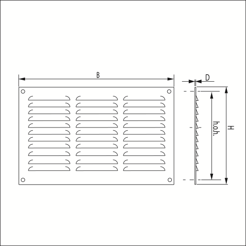 Schoepenrooster vlakke plaat, opbouw. Blank aluminium of poedercoating in wit RAL 9010 en zwart RAL 9005. Bevestigingsgaten: Ø 4 mm