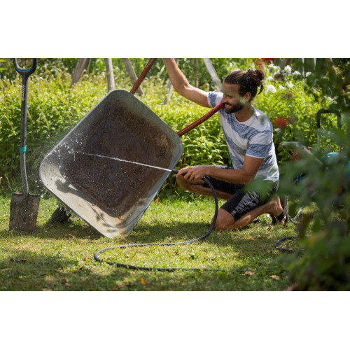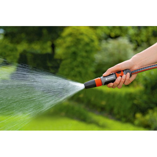 Of je nu schoon wil maken of besproeien, met de GARDENA tuinspuit kun je de gewenste waterstraal kiezen, een harde straal of fijne sproeinevel. Het spuitstuk zit vast en kun je niet verliezen. De gewenste waterstraal is traploos instelbaar. Dankzij de zachte kunststof componenten ligt de tuinspuit prettig en slipvast in de hand.