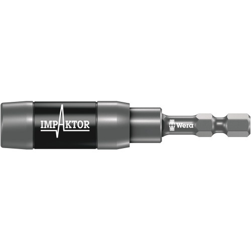 Wera Impaktor-houder voor het afleiden van extreme belastingspieken. Bijzonder torsie-effect dankzij dubbele torsieveer. De Impaktor-houder houdt met zijn ringmagneten bovendien lange en zware schroeven stevig vast. Zo wordt ook razendsnel en veilig plaatsen van schroeven mogelijk. Ook ideaal voor werkzaamheden boven het hoofd. Mocht de magneet niet gewenst zijn, bijvoorbeeld bij werkzaamheden aan metalen delen, kan deze uit de schroefsectie worden verwijderd en zo worden uitgeschakeld. Toepassing voornamelijk bij handmatig machinaal schroeven. Aandrijving: Geschikt voor plaatsing van bits met 1/4" buitenzeskant-aandrijving conform DIN ISO 1173-C 6,3. Aandrijving: 1/4" zeskant, passend in schroefmachines met opname conform DIN ISO 1173-F 6,3.