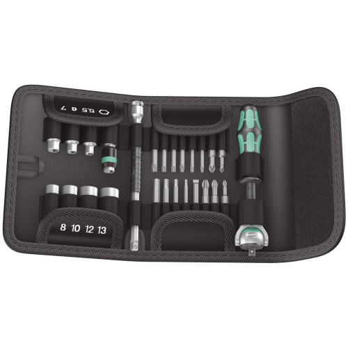 voorzien van hoogwaardige bits - taaiharde uitvoering - voor hand- en machinetoepassingen - dopsleutelbits en cycloopratel met 6,3 mm 1/4"-vierkantaandrijving • dopsleutelbits (koppen) van chroom-vanadium-staal • matverchroomd met buitenkantafwerking - koppen geschikt voor handbediening en aandrijving met accu-schroevendraaiers • fijnvertande ratel met kopfixatie • verlengstuk met sneldraaihuls • bits met directe aansluiting voor accu-schroevendraaier Bijzondere productvoordelen van de ratel: • Vrij scharnierende ratelkop met vaste ratelposities • Fixering van bits en verbindingsdelen via druk op de knop/kogelvergrendeling • Fijnvertand - ratelhoek slechts 5 graden • In 0-graden-stand ook te gebruiken als schroevendraaier • Meercomponenten-Kraftform-greep • hoge werksnelheid • combineert de voordelen van 6 gereedschappen in één ratel Inhoud: 1 fijnvertande cycloop-scharnier- en omschakelratel 6,3 mm (1/4") met kop-fixering , draaimassaconstructie en sneldraaihuls voor hoge werksnelheid 1 6-kant-dopsleutelbit maat 5,5 - 6 - 7 - 8 - 10 - 12 en 13 mm 1 verlengstuk 150 mm met sneldraaihuls 1 bit voor sleufschroeven maat 5,5 mm 1 bit voor kruiskopschroeven (PH) maat 1 - 2 - 3 1 bit voor kruiskopschroeven (PZD) maat 1 - 2 - 3 1 bit voor bouten met binnen-TORX®-profiel maat T 10 - T 15 - T 20 - T 25 - T 27 - T 30 1 bit voor binnenzeskantschroeven maat 3 - 4 - 5 - 6 mm 1 adapter 6,3 mm (1/4")-binnenvierkant naar 6,3 mm (1/4")-binnenzeskant Bitlengte telkens 50mm