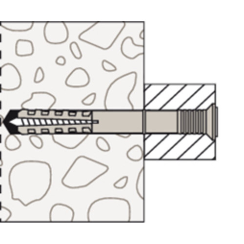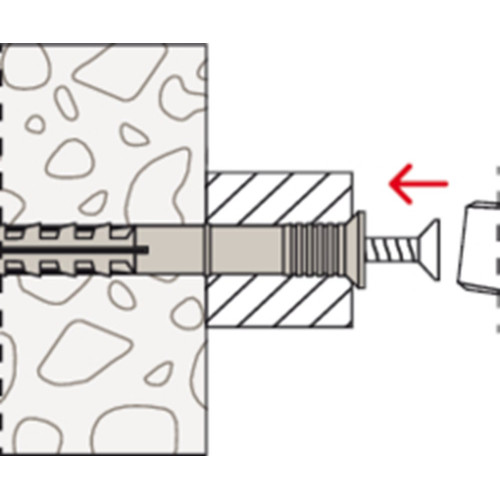 De fischer Nagelplug N-S met verzonken kop bestaat uit een plug van kwalitatief hoogwaardig nylon en een gegalvaniseerde nagelschroef. Deze zijn voor een snelle montage reeds vooraf gemonteerd. De nagelplug wordt in de tijdbesparende doorsteekmontage door het montagestuk gevoerd. Bij het intikken van de nagelschroef spreidt de huls open en verankert in het materiaal. De fischer Nagelplug N-S met verzonken kop is ideaal voor de bevestiging van houtconstructies in allerlei bouwmaterialen in de interieurbouw.