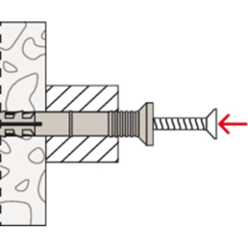 De fischer Nagelplug N-S met verzonken kop bestaat uit een plug van kwalitatief hoogwaardig nylon en een gegalvaniseerde nagelschroef. Deze zijn voor een snelle montage reeds vooraf gemonteerd. De nagelplug wordt in de tijdbesparende doorsteekmontage door het montagestuk gevoerd. Bij het intikken van de nagelschroef spreidt de huls open en verankert in het materiaal. De fischer Nagelplug N-S met verzonken kop is ideaal voor de bevestiging van houtconstructies in allerlei bouwmaterialen in de interieurbouw.