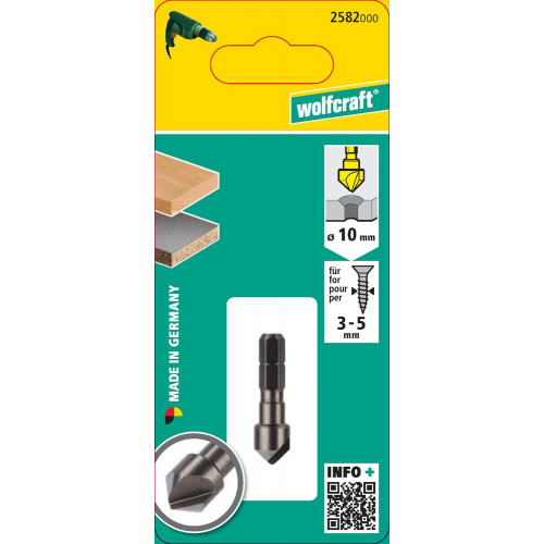 Verzinkboor WS, zeskantschacht SW 6,35 mm (¼") . Ø 10 mm. Voor verzinkkopschroeven Ø 3-5 mm. Hoek 45°. Rechtsdraaiend. Toerental max. 1.500 RPM. Gereedschapsstaal. Zeskantschacht voor snelle gereedschapswissel in bithouders. Goed geschikt Hout, Kunststof, Non-ferrometaal