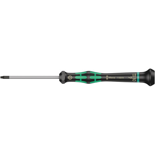 Hoogwaardige Wera Micro-schroevendraaier voor fijnmechanische schroefwerkzaamheden. Voor TORX® veiligheidsschroefverbindingen: TORX® BO schroeven hebben een schroefprofiel met uitstekende lip. Om ongeoorloofd losdraaien te voorkomen, kunnen deze schroeven niet met normaal in de handel verkrijgbaar TORX® gereedschap bediend worden. Alleen speciaal TORX® BO gereedschap is voorzien van een boring waarin de lip valt. Door afsteunen van de hand op de draaikap en de sneldraaizone onder de draaikap is razendsnel heen-en-weer draaien mogelijk. Tijdrovend ompakken behoort tot het verleden. Krachtzone met geïntegreerde zachte delen zorgt voor overdracht van hoge losdraai- en aanhaalmomenten. Precisiezone voor de juiste draaihoek bij afstelwerkzaamheden. De Wera Black Point-punt biedt een hoge pasnauwkeurigheid en extra bescherming tegen corrosie. "Take it easy tool finder": met kleurcodering op profiel en maatcode - voor het eenvoudig en snel vinden van het benodigde gereedschap.