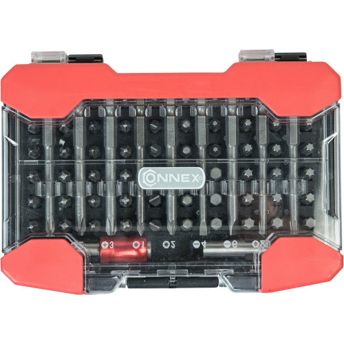 Het juiste bit voor elke behoefte! Geen enkele werkplaats mag de 71-delige bitset van Connex missen om ideaal uitgerust te zijn voor een breed scala aan schroeftaken. De set bevat alle gangbare standaardprofielen, waarbij het praktische kleurcodesysteem het gemakkelijk maakt om de afzonderlijke aandrijvingen te vinden. In combinatie met de twee bithouders kunnen de inzetstukken eenvoudig worden gebruikt met een accuschroevendraaier. Een van de bithouders is zelfs gepatenteerd vanwege zijn extra sterke magneet en snelspanboorhouder.