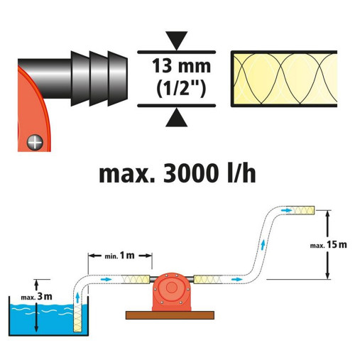 De compacte en zelfaanzuigende pomp met kunststofbehuizing van wolfcraft. Capaciteit max.1.300 liter per uur. Slangaansluiting 1/2? (13 mm) / 0 . Aanzuighoogte 3 m. Droogloop max. 30 s. Schacht 6 mm Toerental max. 2.800 RPM. helpt u op ideale wijze om vloeistoffen snel en ongecompliceerd te pompen. Hij is zeer geschikt voor het legen van waterbedden of de regenton. De waterpomp werkt met normaal in de handel verkrijgbare boormachines met een vermogen van minstens 600 watt. Met de lichte kunststofbehuizing en de krachtige pompcapaciteit is de universele pomp een duurzaam, betrouwbaar hulpmiddel en een compact, handig alternatief voor grote tuinpompen.